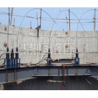 ⑤将一节标准段筒体吊放在烟囱零米的轨道平板小车上,水平推进烟囱内,通过地锚与钢绞线束的下端头相连。将钢绞线逐根进行预紧、对液压顶升进行系统调试后,即可进行正式提升。