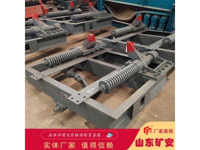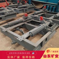 井口操车系统配套阻车器使用的阻轮式阻车器,有一对阻爪和弹簧缓冲装置,当车轮撞击阻爪时,阻爪使套在固定轴后部的弹簧压缩,撞击的能量便为弹簧吸收。阻爪 的尾部通过连杆和操纵机构连接,液压缸活塞杆的往复运动使两个阻爪同时打开或关闭,关闭时阻车,打开后矿车即可通过。 kuangan002