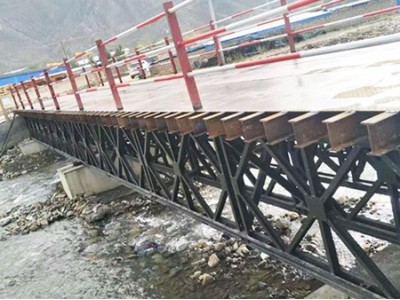跨度需求与荷载等级的关系呈现 “制约与适配” 的核心逻辑,跨度延伸需以承载能力优化为前提。贝雷桥的跨度设计需严格匹配荷载等级:当荷载等级较低(如行人、轻型车辆,3-5t)时,可采用常规单排贝雷片拼装,跨度控制在 10-15m,此时贝雷片的桁架结构足以通过自身抗弯刚度分散荷载,无需额外增加;当荷载等级提升(如中型施工车辆,8-15t),跨度需控制在 8-12m,或通过增加贝雷片排数(如双排拼接)、加密桁架片腹杆间距(从 0.8m 缩至 0.5m)提升承载能力,避免跨度与荷载的不匹配导致弦杆受压屈曲或腹杆剪切失效。从力学规律来看,贝雷桥的承载能力与跨度的平方成反比,跨度每增加 1 倍,承载能力需提升 4 倍以上才能维持平衡 —— 例如 10m 跨度可承载 10t 的贝雷桥,当跨度增至 20m 时,需通过双层桁架结构、钢材升级等方式,将承载能力提升至 40t 以上,才能达到同等荷载需求。 地质条件对跨度与荷载的适配起 “基础性约束” 作用,不同地质的承载力直接决定桥梁基础的支撑能力。在承载力较不错的地质环境(如密实砂土、硬黏土,地基承载力特征值 fak≥150kPa)中,基础可采用简易条形基础或立支座,贝雷桥的跨度与荷载适配空间愈大 —— 例如可实现 20-30m 跨度与 15-25t 荷载的匹配,基础仅需通过混凝土垫层分散压力,即可稳定支撑桥梁整体;在中等承载力地质(如粉质黏土、松散砂土,fak=100-150kPa)中,需优化基础形式(如扩大基础底面积、增设砂石垫层),同时适当降低跨度或荷载等级,例如将跨度控制在 10-20m,荷载限制在 10-15t,避免基础沉降导致桥梁倾斜;在低承载力地质(如软土、沼泽地,fak<100kPa)中,地质条件成为核心制约因素,需采用桩基基础(如螺旋桩、预制桩)将荷载传递至深层稳定土层,此时贝雷桥的跨度需缩短至 8-15m,荷载控制在 5-10t,同时通过增加基础数量(如每 3-4m 设置一组桩基)提升支撑稳定性。
